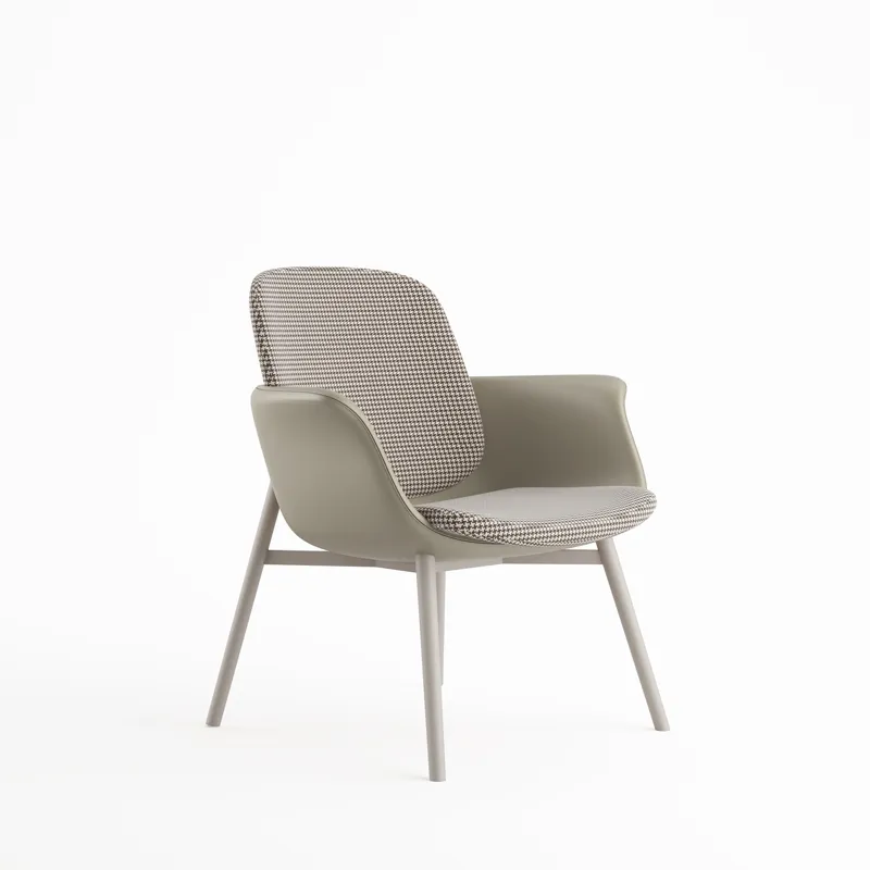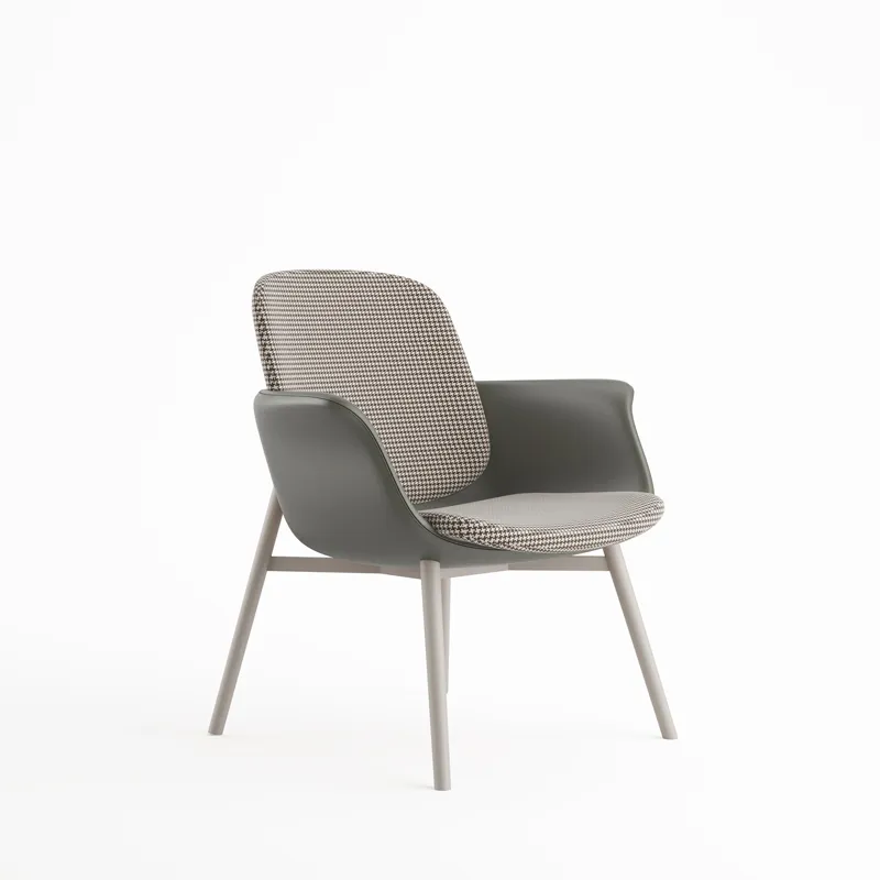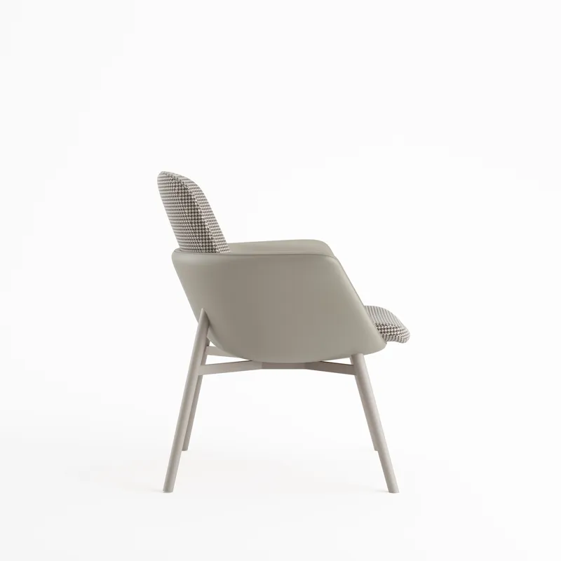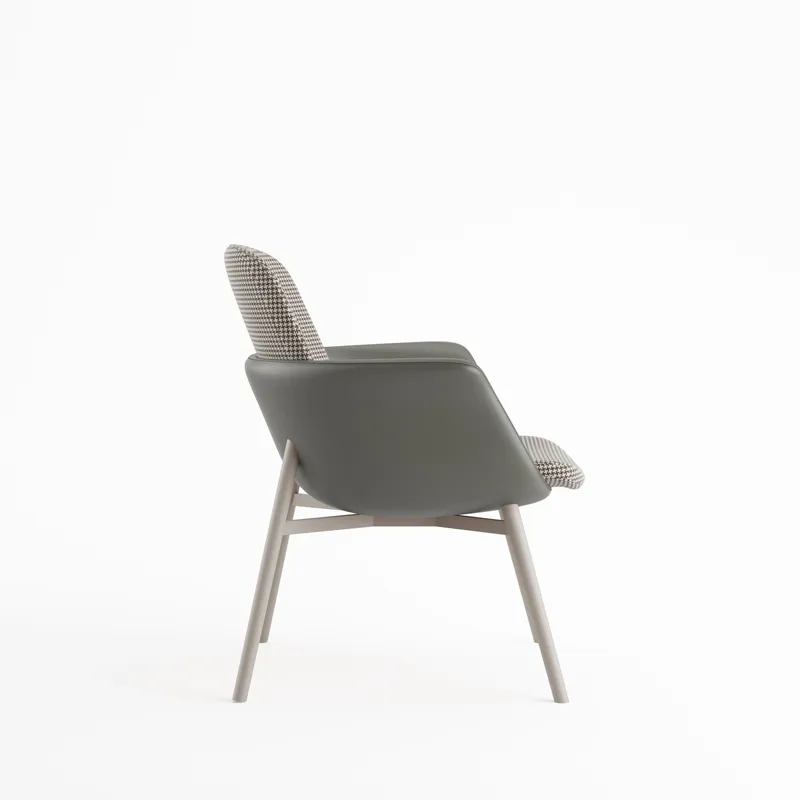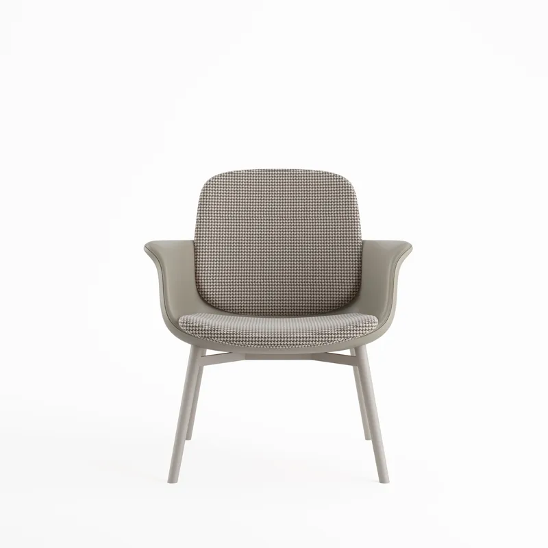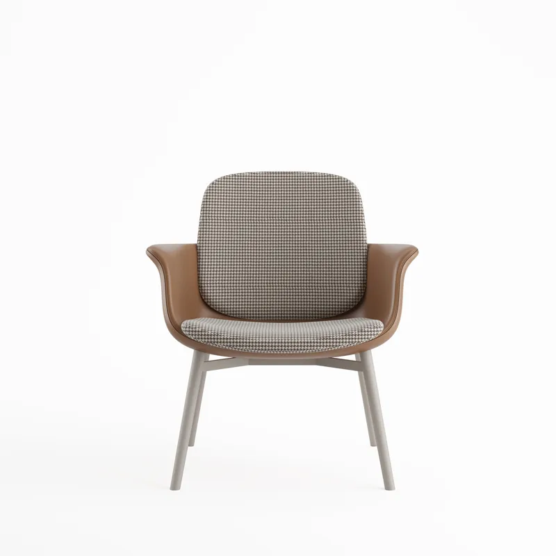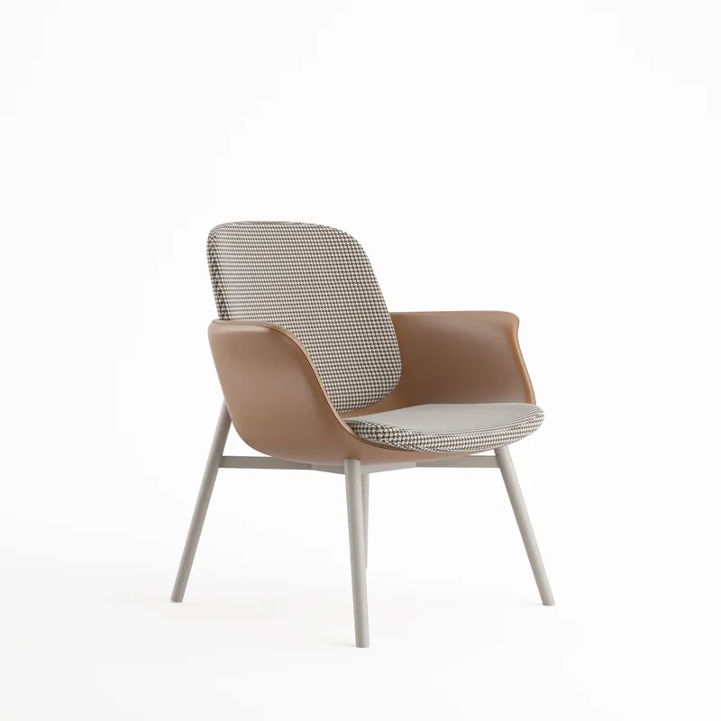 Обивка выполнена из комбинированных материалов — ткани с тройной защитой (водо-, грязе- и маслостойкой) и высококачественной натуральной бычьей кожи премиум-класса; наполнение — формованный пенополиуретан плотностью 55, обладающий отличной упругостью и долговечностью; опора из металлического каркаса с декоративной отделкой из кованого железа.