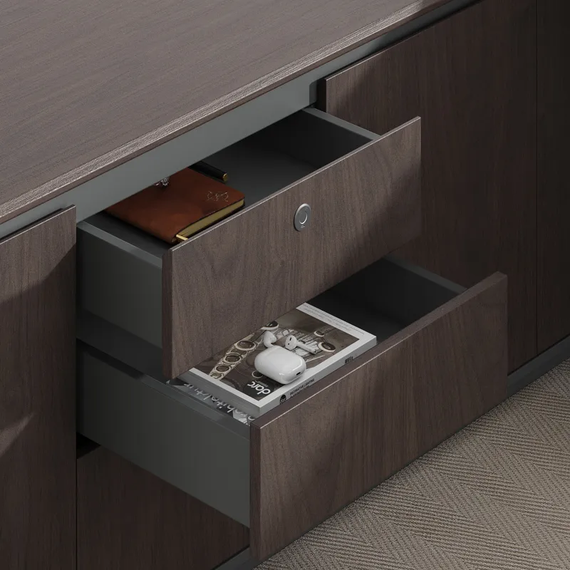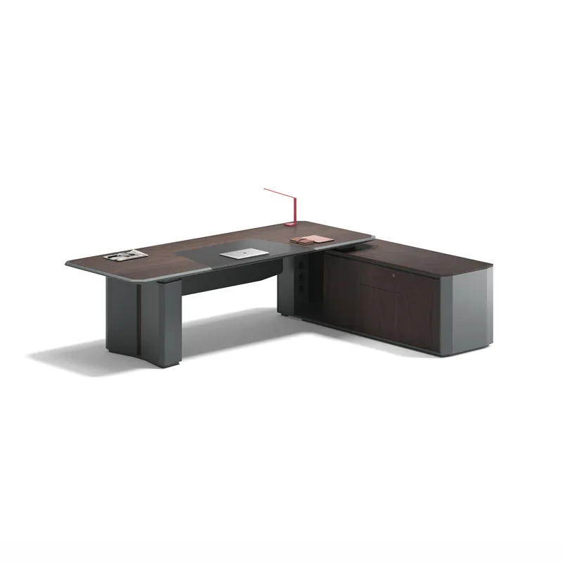 Рабочий стол GF302 серии "Цзунь" — это высококачественный офисный стол, созданный для руководящего состава. Он сохраняет общий дизайнерский стиль, а использование технологии смешанной отделки лаком придаёт каждому элементу премиальную эстетику.