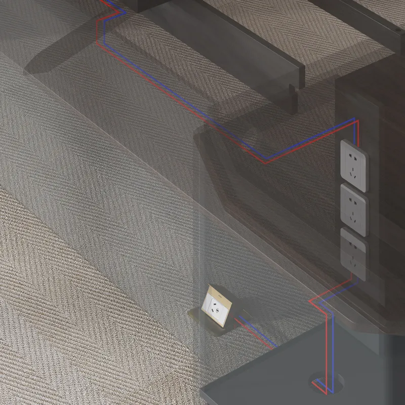 Комплектация: скрытые направляющие с системой открытие нажатием,, деревянный откидной кабельный органайзер, сертифицированная по стандарту 3C многофункциональная розетка, дверные петли с демпфером, интеллектуальный замок с распознаванием отпечатков пальцев, столешница с антигрязевой кожей, отверстие под розетку 86 в дополнительном шкафу.