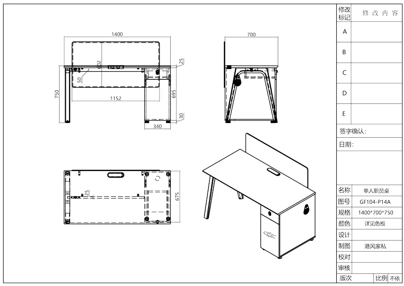 | 2 | Рабочий стол для одного сотрудника | GF104-P14A | 1400*700*750mm | Офис сотрудников Открытая офисная зона |