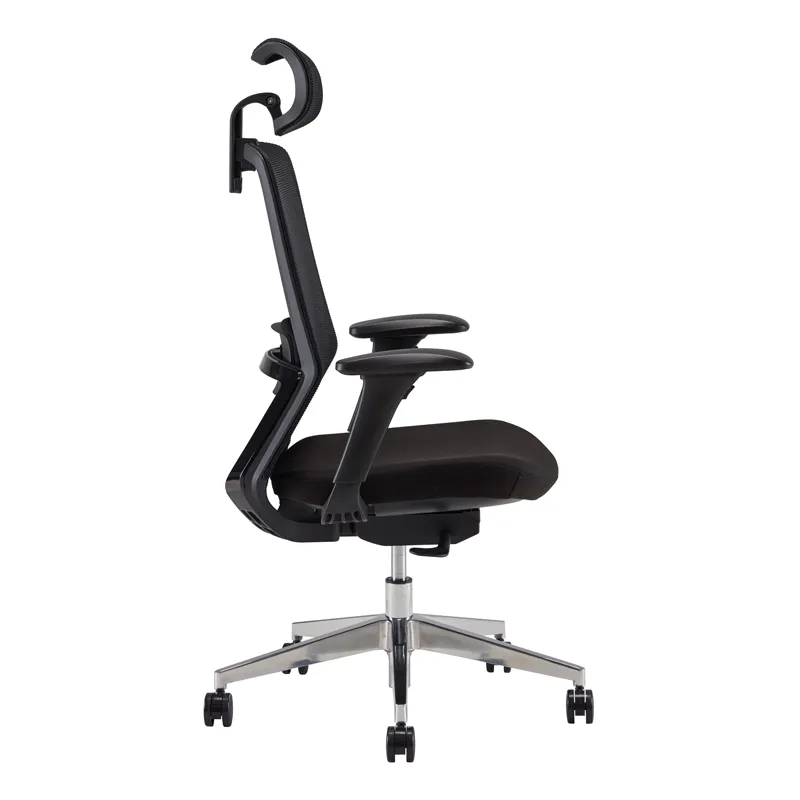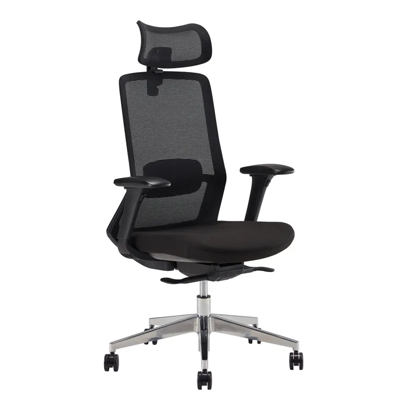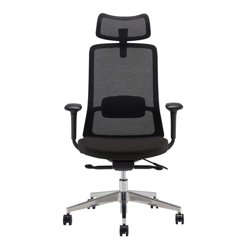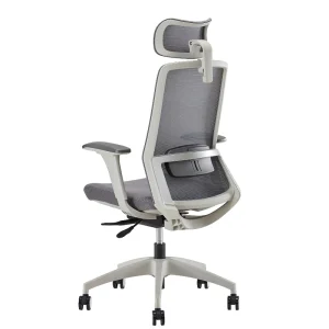 Спинка кресла выполнена с нейлоновой рамой и высококачественной нейлоновой сеткой, подголовник регулируется по высоте, а мягкая поясничная поддержка также имеет регулировку.