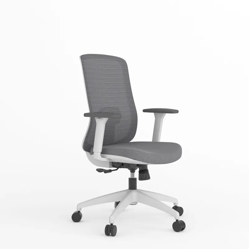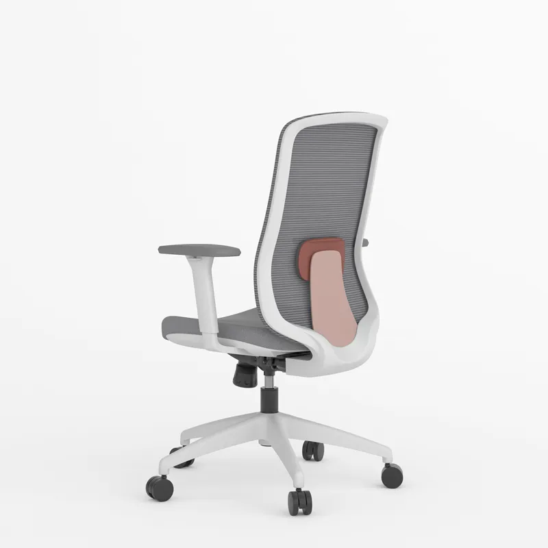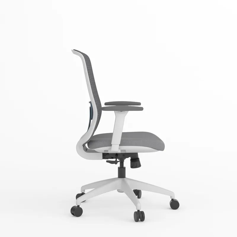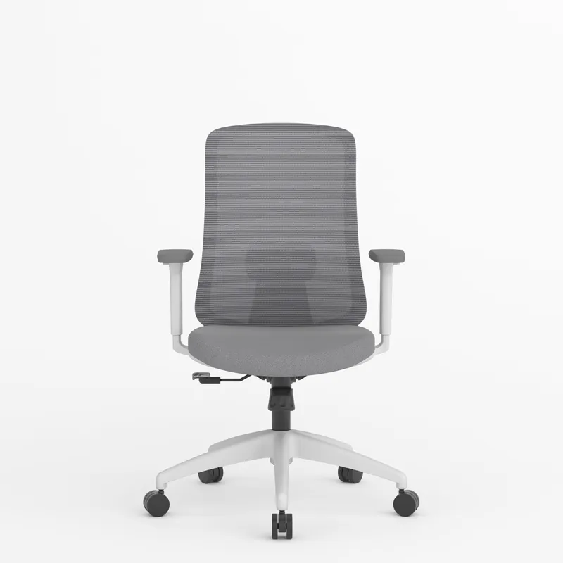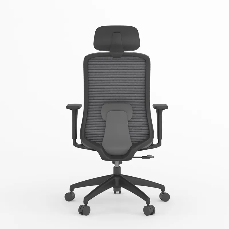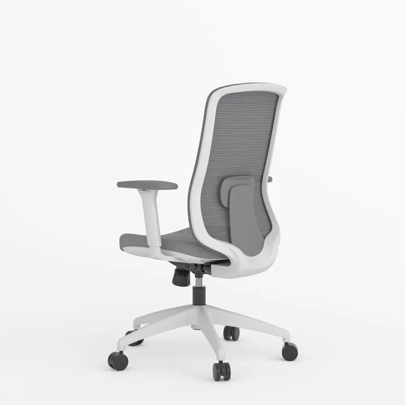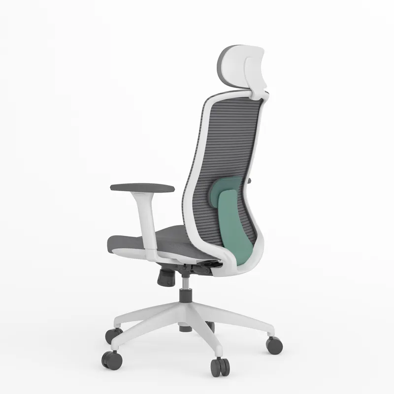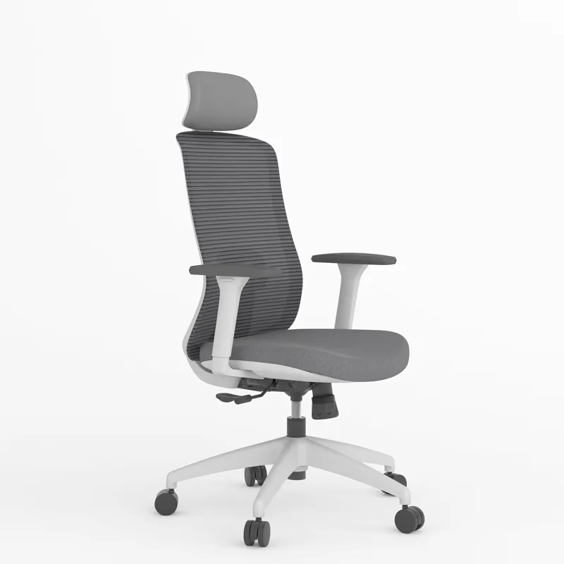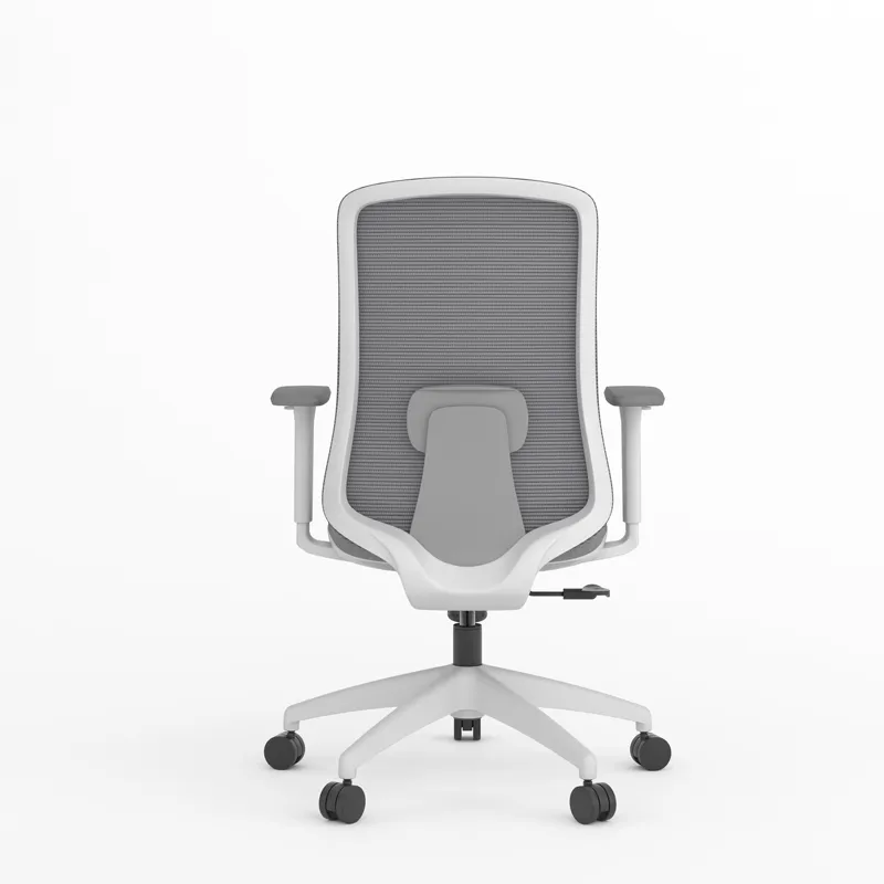 Нейлоновая рама спинки; спинка из высококачественной нейлоновой сетки; регулируемый по высоте подголовник; сиденье из формованного поролона плотностью 50#; 3D подлокотники из PU с регулировкой по высоте; нейлоновое основание диаметром 345 мм; белые нейлоновые колёса диаметром 60 мм; газлифт Sanhong 100 мм с порошковым покрытием; синхронный механизм «бабочка» с фиксацией в трёх положениях.